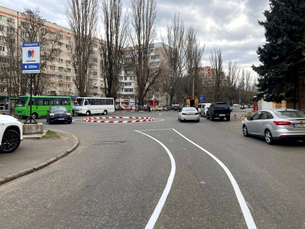 Фахівці комунального підприємства «СМЕП» виконали нанесення дорожньої розмітки, облаштували внутрішнє кільце з гумових бар'єрів, а також встановили відповідні дорожні знаки для позначення кругового руху.